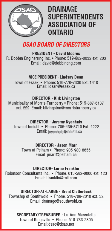 Welcome to the Drainage Superintendents Association of Ontario (DSAO). Our main objective is assisting landowners to resolve their drainage concerns utilizing the Ontario Drainage Act. We may also be of interest to anyone within the drainage industry or with an interest in municipal drainage works.